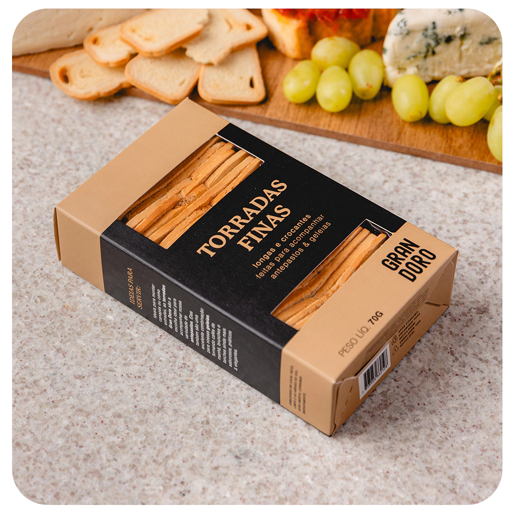 As torradas Gran Doro são longas, finas e crocantes, ideais para montagem de canapés e para acompanhar nossos antepastos e geleias. Feitas com farinha de trigo enriquecida com ferro e ácido fólico, xarope de glicose, gordura vegetal, sal com teor reduzido de sódio, fermento biológico seco, emulsificante lecitina de soja, melhorador de farinha ácido ascórbico, glúten e conservante propionato de cálcio.